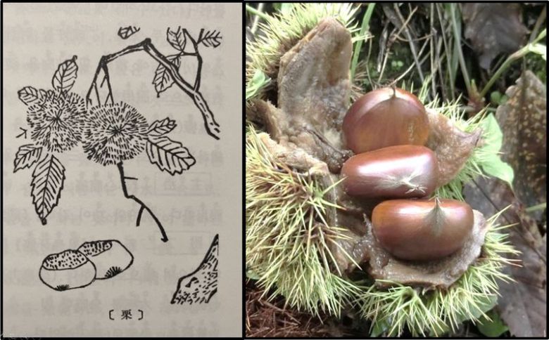 <본초강목>에 그려진 율(栗, 밤)(왼쪽)과 가을 밤나무에서 다 익어서 저절로 떨어진 생밤의 모습