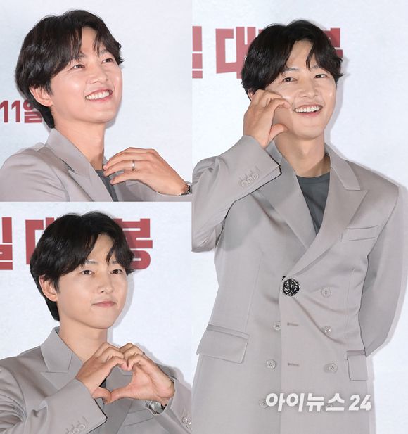 '하트 소리가 나오기도 전에 쌍하트' 배우 송중기가 22일 오후 서울 강남구 삼성동 메가박스 코엑스에서 열린 영화 '화란'(감독 김창훈) 언론시사회에 참석하고 있다. [사진=정소희 기자]