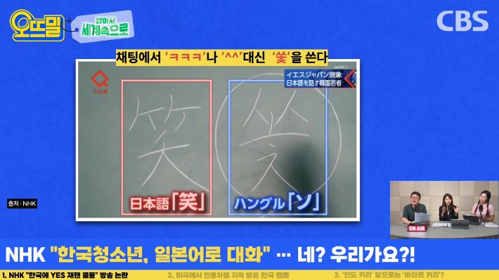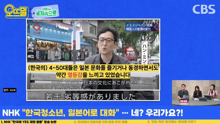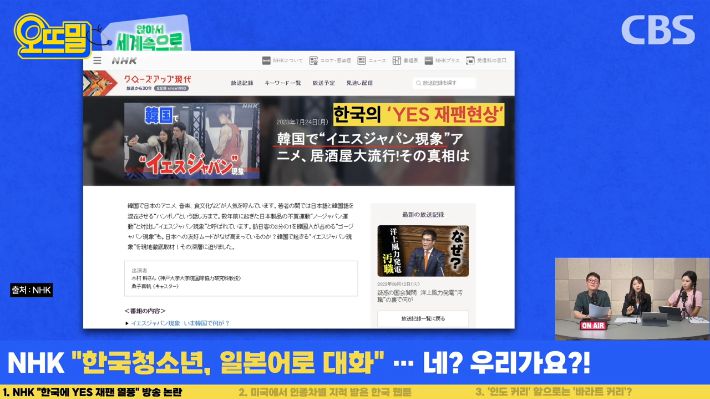 ◇ 서연미> 네, 여기까지 NHK의 '한국 YES 재팬 열풍' 방송에 대한 논란 다뤄봤습니다. 박수정 PD, 조석영 PD, 수고하셨습니다.