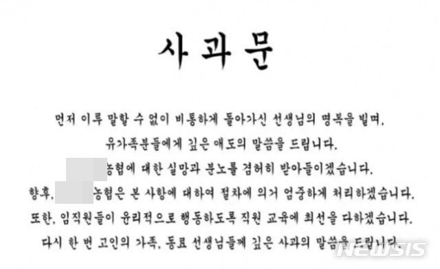 농협은 "임직원들이 윤리적으로 행동하도록 직원 교육에 최선을 다하겠다"면서 "다시 한번 고인의 가족, 동료 선생님들께 깊은 사과의 말씀을 드린다"며 고개를 숙였다.