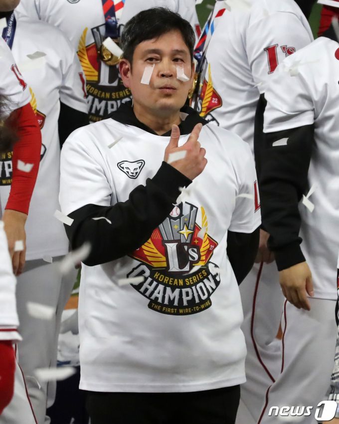 지난해 11월8일 오후 인천시 미추홀구 SSG 랜더스필드에서 열린 프로야구 '2022 신한은행 SOL KBO 포스트시즌' 한국시리즈 6차전 키움 히어로즈와 SSG 랜더스의 경기에서 4대3으로 승리하며 우승을 차지한 정용진 SSG 구단주가 눈에 종이 꽃가루를 붙인 채 선수들과 대화를 나누고 있다. /사진=뉴스1