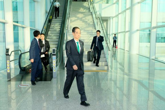 한덕수 국무총리가 23일 중국 항저우 아시안게임 개막식 참석을 위해 인천공항에서 출발하고 있다. 총리실 제공 뉴시스 |