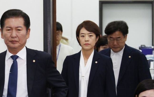 22일 국회에서 열린 더불어민주당 최고위원회의에 정청래, 고민정 최고위원 등이 어두운 표정으로 입장하고 있다. 연합뉴스
