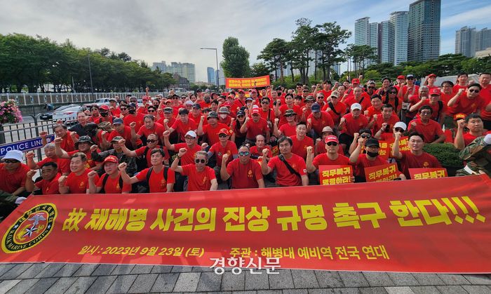 해병대 예비역들이 23일 고 채모 해병대 상병 사망에 대한 진상규명과 박정훈 전 해병대 수사단장(대령)의 원대복귀를 촉구하는 집회를 열었다.