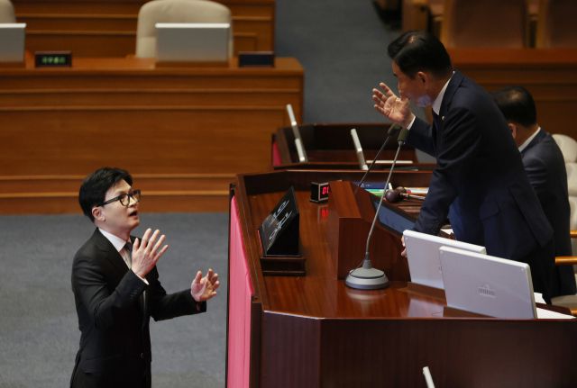 ▲21일 국회 본회의장에서 더불어민주당 이재명 대표 체포동의안 표결을 앞두고 한동훈 법무장관이 취지 설명을 하던 중 야당 의원들이 항의하자 김진표 국회의장이 짧은 설명을 주문하고 있다. ⓒ연합뉴스