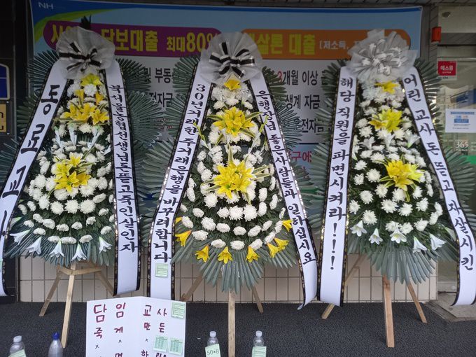 지난 22일 오후 해당 학생의 어머니인 A씨가 근무하는 서울의 한 지역농협 입구에는 세 개의 근조화환이 줄지어 서있는 모습을 볼 수 있었다. 근조화환에는 ‘동료 교사’, ‘선생님 돈 뜯고 죽인 살인자’, ‘30년 주거래 은행을 바꾸려 합니다’, ‘은행장님 좋은 사람들과 일하십시오’ 등의 글이 적혔다. ‘담임교사 죽게 만든 XXX 파면하라’ 등 손글씨가 적힌 종이도 놓여있었다.
