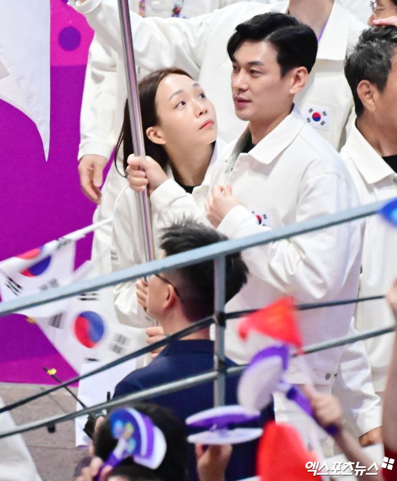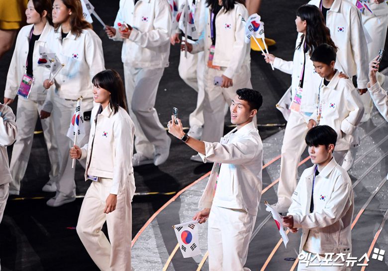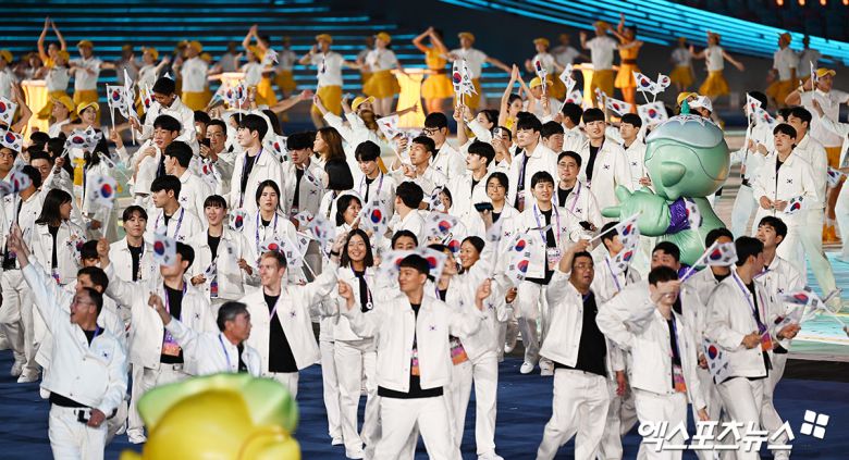 최윤 한국 선수단장과 장재근 부단장(진천 국가대표선수촌장)이 이끄는 선수단은 흰색 상하의 트렌드 복장을 착용했다. 손에 태극기를 흔들며 당당하게 행진했다. 우리나라는 선수와 임원을 합쳐 역대 최다인 1천140명의 선수단이 항저우에서 금메달 50개 이상 수확과 종합 순위 3위를 목표로 구슬땀을 흘릴 예정이다.