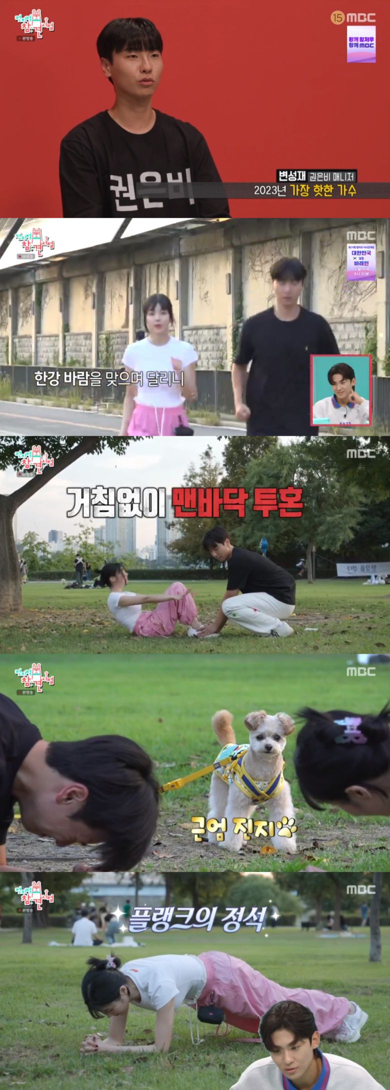 권은비는 달리면서 노래를 흥얼거렸다. 매니저는 "어릴 때는 육상도 했고 마라톤에 나간 경험도 있다더라"고 귀띔했다. 다 달린 다음엔 근력 운동을 했다. 그런데 매트도 없이 풀밭에 그냥 누워서 윗몸일으키기를 했다. 덱스는 "자세 좋다"며 감탄했다.