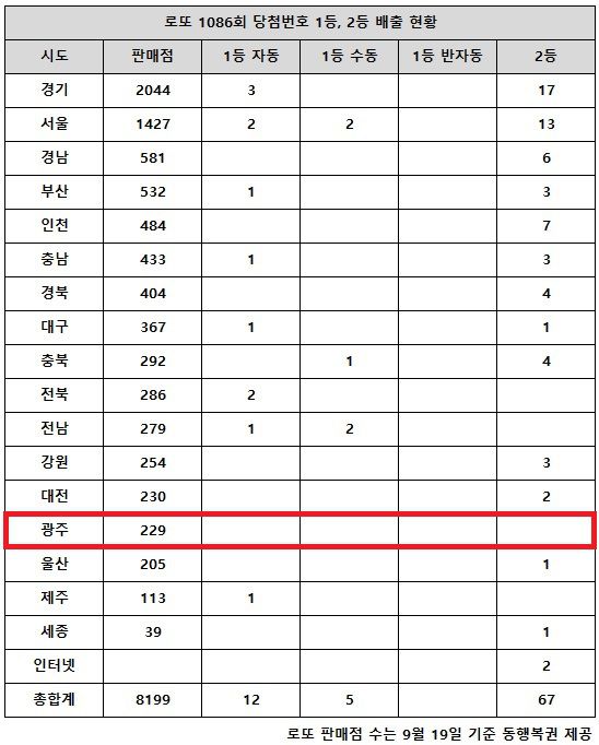동행복권이 23일 추첨한 로또 1086회 당첨번호 조회 결과 1등은 17명, 2등은 67게임이다. 전국 17개 시도 중 광주 지역에서는 로또 고액(1,2등) 당첨 판매점이 단 한 곳도 나오지 않았다.