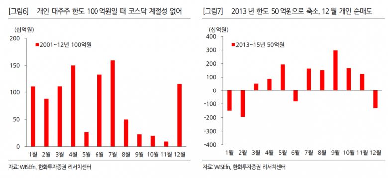 박 연구원은 “개인 대주주 한도는 2013년까지 100억 원이었는데, 이때까진 개인 투자자들의 연말 매도가 관측되지 않았다. 2013년 대주주 한도가 50억 원으로 하향된 이후부터 개인 투자자들은 12월에 주식을 순매도했다”며 “대주주 한도는 2016년 25억 원, 2018년 15억 원으로 낮춰졌고 2020년엔 10억 원까지 하향됐다. 올해도 10억 원이 적용된다”고 말했다.