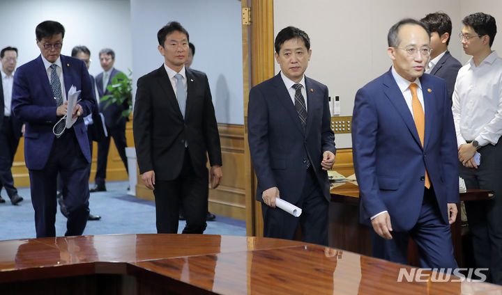 [서울=뉴시스] 김금보 기자 = 추경호(오른쪽 부터) 경제부총리, 김주현 금융위원회 위원장, 이복현 금융감독원 원장, 이창용 한국은행 총재가 21일 오전 서울 중구 은행회관에서 열린 비상거시경제금융회의에 참석하고 있다. 2023.09.21. kgb@newsis.com