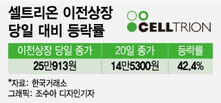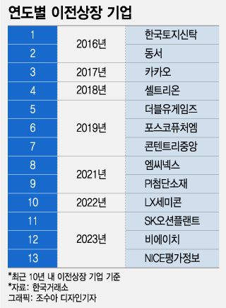 주가도 부진하다. 셀트리온은 코스피 이전 직후에는 상승하는 흐름을 보였지만, 현 주가는 이전상장일 종가(25만913원, 수정주가) 대비 40% 넘게 하락한 상태다. 최근 10년간 코스피 이전 기업 13곳 중 10곳도 주가가 전보다 하락했다.