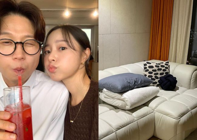 사진에는 거실 소파에 박성광의 이부자리를 내놓은 모습이 담겼다. 이를 본 박성광은 "나 지금 집에 왔는데 왜 안방문이 잠겨있죠?? 저 베게는 나의 것이 분명하긴 한데.."라고 댓글을 남겼다.