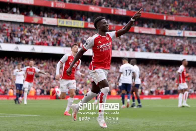 토트넘은 전반 25분 프리킥으로 세트피스 기회를 잡았다. 메디슨이 박스 안으로 볼을 투입했고 존슨이 슈팅했지만 저 멀리 벗어났다. 선제골은 아스널이었다. 전반 26분, 역습 과정에서 사카가 측면에서 볼을 몰고 골문 쪽으로 슈팅했다. 로메로가 걷어내려고 했지만 방향이 굴절돼 그대로 골문으로 빨려 들어갔다. 사카는 토트넘 미드필더 메디슨의 세리머니 '다트 던지기'를 선보이며 흥미로운 도발을 했다.