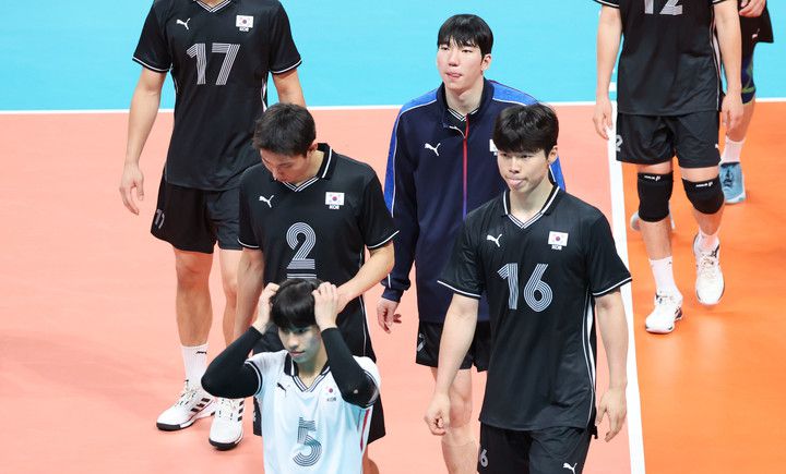 19회 항저우 아시안게임 남자배구 12강 토너먼트 한국과 파키스탄의 경기에서 세트스코어 0-3으로 패한 한국 선수들이 아쉬워하고 있다.(항저우=연합뉴스)