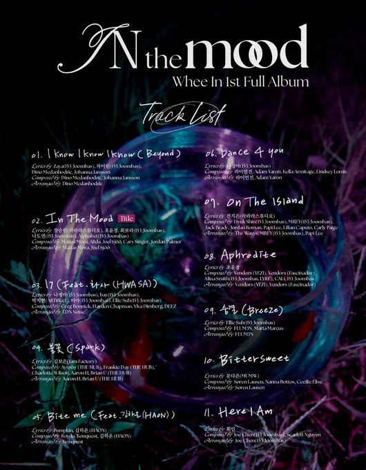 트랙리스트에 따르면 휘인의 새 앨범 '인 더 무드'에는 동명의 타이틀곡 '인 더 무드'를 비롯해 '아이 노우 아이 노우 아이 노우 (비욘드)(I Know I Know I Know (Beyond))', '17', '불꽃 (Spark)', '바이트 미(Bite me)', '댄스 포 유(Dance 4 you)', '온 디 아일랜드(On The Island)', '아프로디테(Aphrodite)', '숨결 (Breeze)', '비터스윗(Bittersweet)', '히어 아이 엠(Here I Am)'까지 다채로운 장르의 총 11곡이 수록됐다.