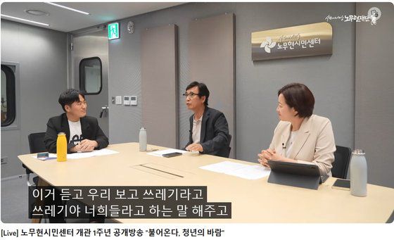 지난 22일 노무현시민센터 개관 1주년을 맞아 유튜뷰 채널 '사람사는세상노무현재단'에 올라온 '불어온다, 청년의 바람' 영상. 왼쪽부터 노무현재단 황희두 이사, 유시민 전 이사장, 조수진 이사. 사진 유튜브 캡처 |
