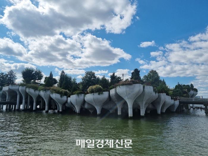 첫 번째로 둘러본 현장은 ‘리틀 아일랜드’입니다. 허드슨강 54번 선착장 인근에 도착하니 꽃봉오리 모양의 거대한 인공 섬이 눈에 들어왔습니다. 세계적인 건축가 토마스 헤더윅이 1만㎡ 규모로 설계한 건축물입니다. 총 사업비는 2640억 원이 들었습니다. 인공 섬이지만 인공적인 느낌은 적었습니다. 섬 안에 정원을 잘 가꿔 놓았기 때문입니다. 35종의 나무와 65종의 관목을 다양하게 심어놨습니다.