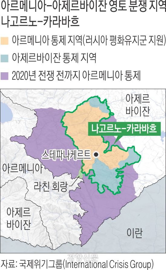 양국은 옛 소련 붕괴 이후 지난 30년간 이 지역을 둘러싸고 두 차례 전쟁을 벌였고, 지난해 12월부터는 아제르바이잔이 이 지역과 아르메니아를 연결하는 유일한 통로인 라친 회랑을 차단해 식량과 연료 공급이 끊기는 등 인도주의적 위기 상황이 벌어졌다.