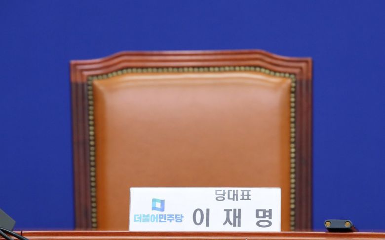 25일 오전 서울 여의도 국회에서 열린 더불어민주당 최고위원회의에서 이재명 대표의 자리가 비어 있다. 2023.9.25/뉴스1