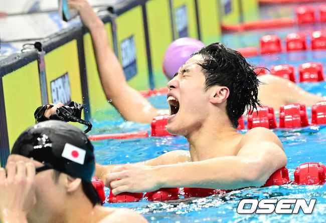 [OSEN=항저우(중국), 김성락 기자] 25일 오후 올림픽 스포츠센터 수영장에서 '제19회 항저우아시안게임' 수영 경영 남자 계영 800m 결승전 경기가 열렸다.한국 대표팀 마지막 주자 황선우가 경기를 마친 뒤 기뻐하고 있다. 이날 한국 대표팀은 양재훈~이호준~김우민~황선우 순으로 헤엄쳐 7분01초73의 기록으로 금메달을 목에 걸었다. 2023.09.25 / ksl0919@osen.co.kr