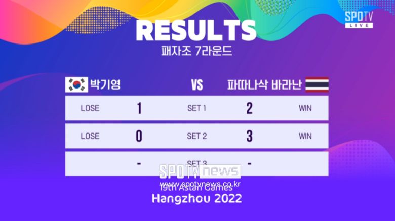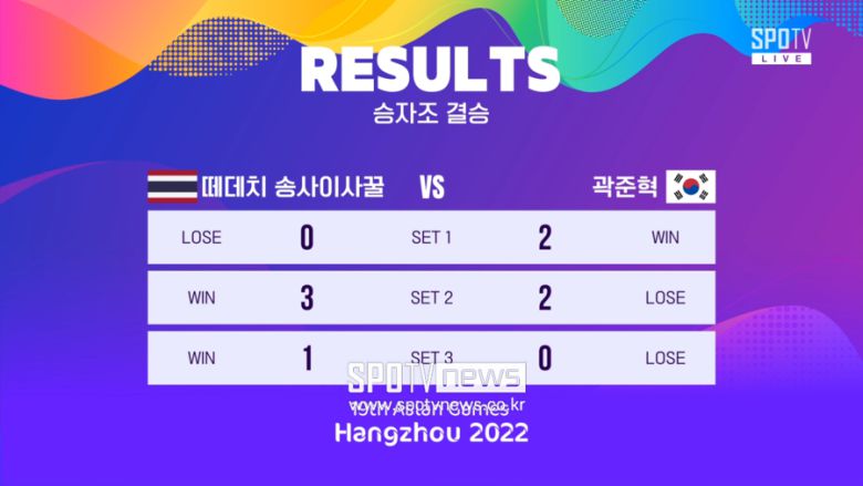 박기영의 아시안게임 일정은 종료됐지만 곽준혁에게는 아직 한 번의 기회가 더 남았다. 더블 엘리미네이션으로 진행되는 대회로 인해 곽준혁은 패자조 결승전에서 다시 한 번 결승 진출을 놓고 경기를 펼친다. 상대는 박기영을 꺾은 파따나삭 바라난(Phatanasak VARANAN)으로 곽준혁은 이미 토너먼트에서 승리를 거둔 경험이 있다.