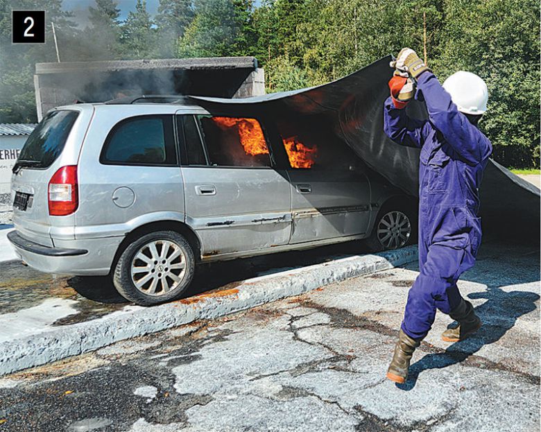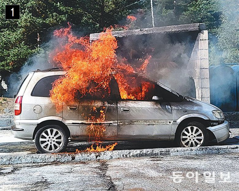 안전센터 요원이 승용차 시트에 불을 붙이자 몇 분 지나지 않아 불길이 창문을 넘어 차 전체로 퍼지기 시작했다. ‘빨리 꺼야 한다’는 생각이 들 무렵 요원들은 큼지막한 ‘특수 담요(질식소화포)’로 차를 덮었다.