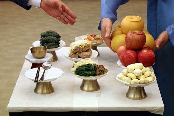 성균관의례정립위원회는 지난해 서울 중구 프레스센터에서 '대국민 차례 간소화 기자회견'을 갖고 간소화 된 차례상 예시를 발표하고 있는 모습. [사진=뉴시스] |