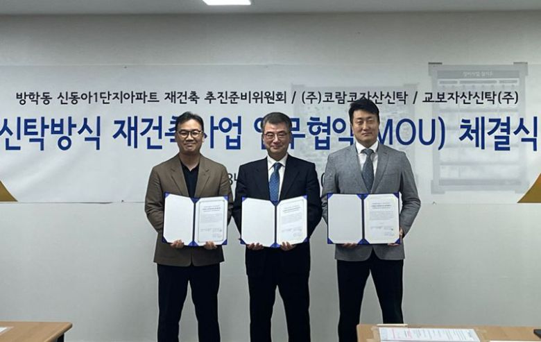 [파이낸셜뉴스] 코람코자산신탁-교보자산신탁은 지난 25일 주민동의율 91%로 ‘방학 신동아1단지 신탁방식 재건축’ 예비신탁사로 선정됐다. 신동아1단지 재건축 추진준비위원회는 업무협약을 맺으면서다.