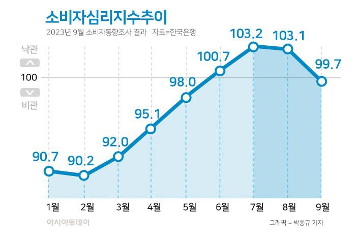 한국은행이 26일 발표한 '2023년 9월 소비자동향조사 결과'에 따르면 이달 중 소비자심리지수(CCSI)는 99.7로 전월(103.1)보다 3.4포인트(p) 하락했다.