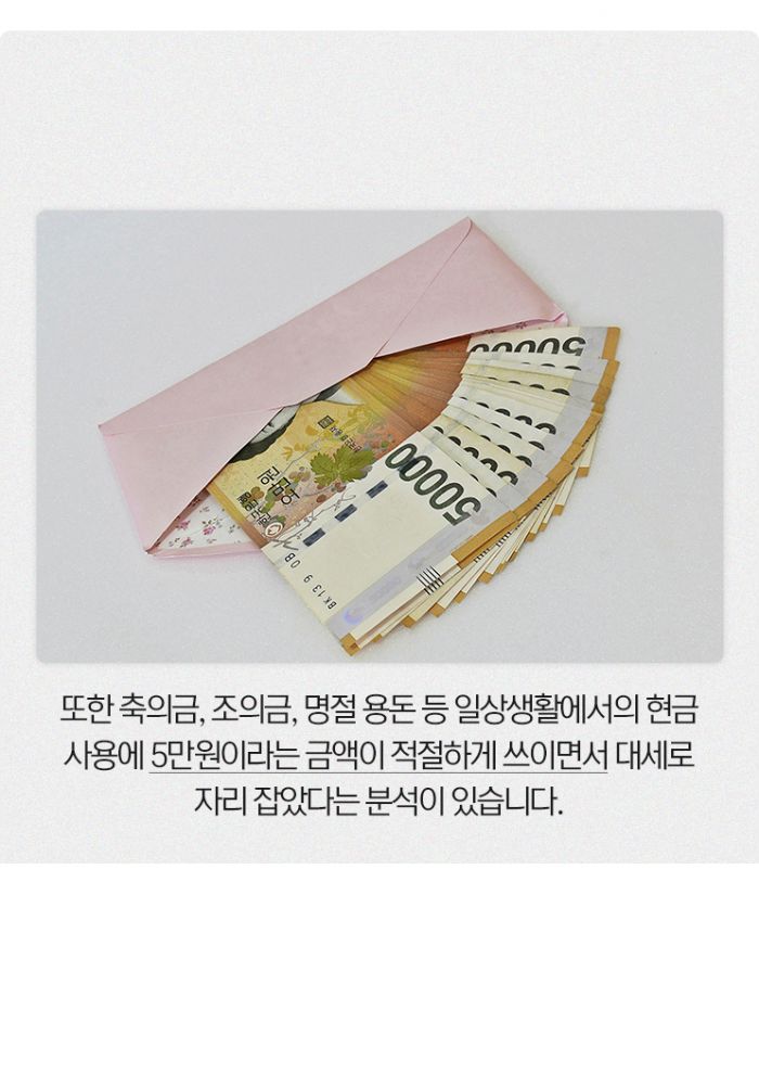 또한 축의금, 조의금, 명절 용돈 등 일상생활에서의 현금 사용에 5만원이라는 금액이 적절하게 쓰이면서 대세로 자리 잡았다는 분석이 있습니다.