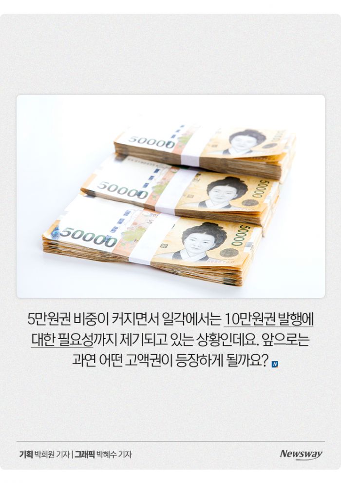 5만원권 비중이 커지면서 일각에서는 10만원권 발행에 대한 필요성까지 제기되고 있는 상황인데요. 앞으로는 과연 어떤 고액권이 등장하게 될까요?
