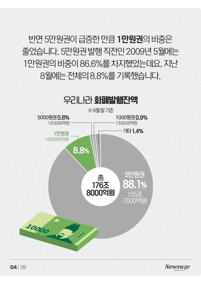 반면 5만원권이 급증한 만큼 1만원권의 비중은 줄었습니다. 5만원권 발행 직전인 2009년 5월에는 1만원권의 비중이 86.6%를 차지했었는데요. 지난 8월에는 전체의 8.8%를 기록했습니다.