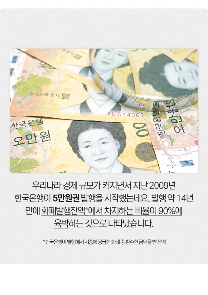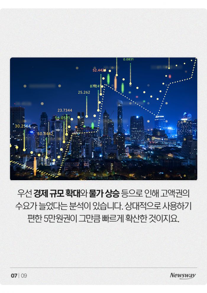 우선 경제 규모 확대와 물가 상승 등으로 인해 고액권의 수요가 늘었다는 분석이 있습니다. 상대적으로 사용하기 편한 5만원권이 그만큼 빠르게 확산한 것이지요.