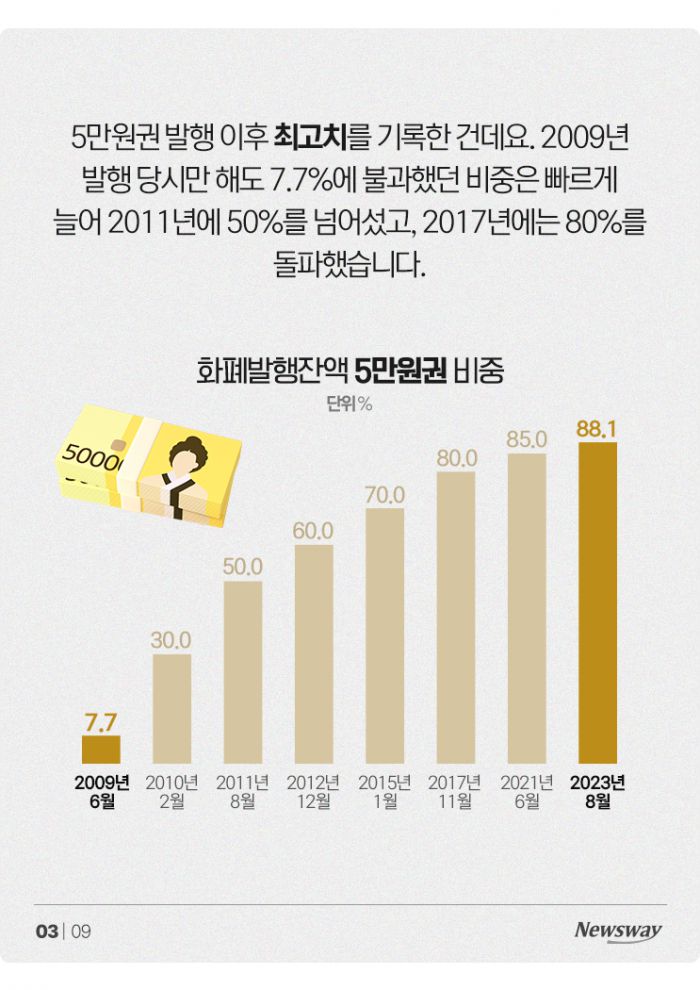5만원권 발행 이후 최고치를 기록한 건데요. 2009년 발행 당시만 해도 7.7%에 불과했던 비중은 빠르게 늘어 2011년에 50%를 넘어섰고, 2017년에는 80%를 돌파했습니다.