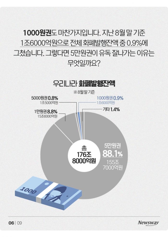 1000원권도 마찬가지입니다. 지난 8월 말 기준 1조6000억원으로 전체 화폐발행잔액 중 0.9%에 그쳤습니다. 그렇다면 5만원권이 유독 잘나가는 이유는 무엇일까요?