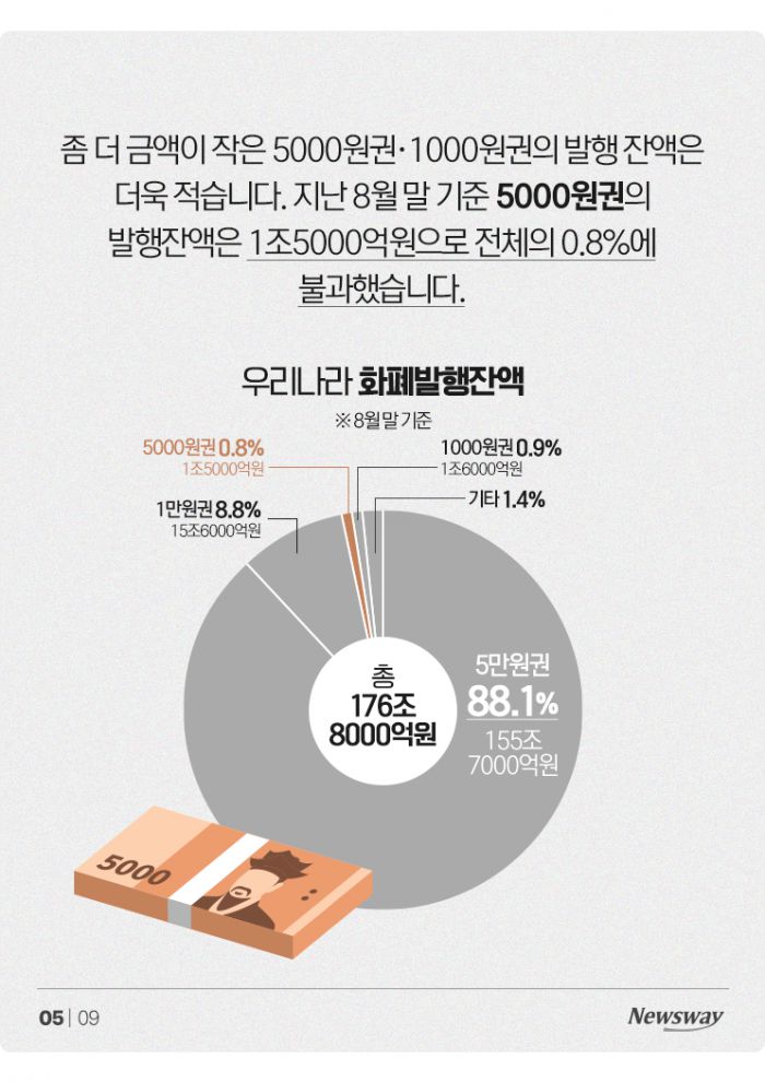 좀 더 금액이 작은 5000원권·1000원권의 발행 잔액은 더욱 적습니다. 지난 8월 말 기준 5000원권의 발행잔액은 1조5000억원으로 전체의 0.8%에 불과했습니다.