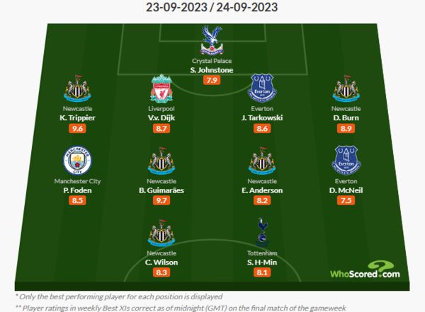 손흥민의 프리미어리그 이주의 팀 '싹쓸이 행진'은 여기에서 멈추지 않았다. 유럽축구통계업체 '후스코어드닷컴'은 손흥민에게 평점 8.12점을 매겼고, 프리미어리그 6라운드 이주의 팀에 선정했다. 4-4-2 포메이션에서 칼럼 윌슨과 투톱을 배치했고, 2선엔 필 포든, 기마랑이스, 안데르손, 고든, 포백은 트리피어, 타코우스키, 판 데이크, 번이었다. 골키퍼 장갑은 존스톤이 꼈다.