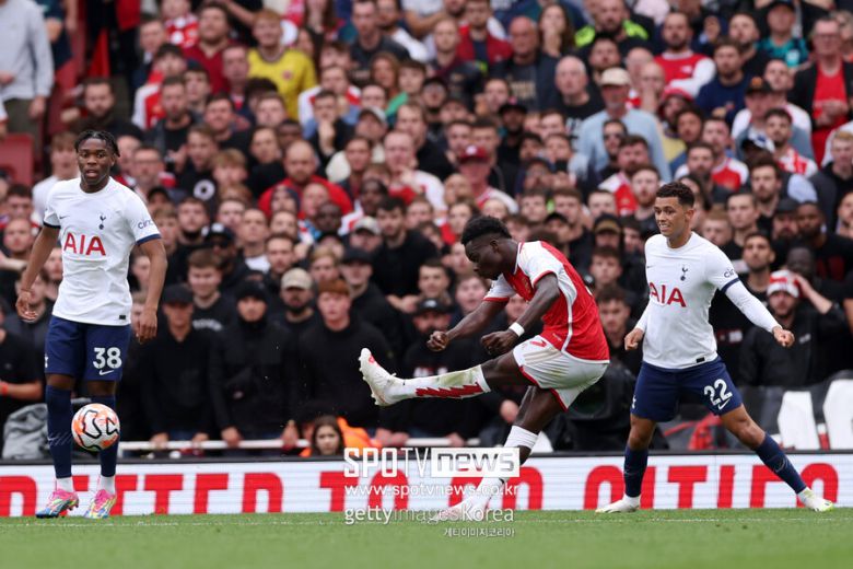 토트넘은 전반 25분 프리킥으로 세트피스 기회를 잡았다. 메디슨이 박스 안으로 볼을 투입했고 존슨이 슈팅했지만 저 멀리 벗어났다. 선제골은 아스널이었다. 전반 26분, 역습 과정에서 사카가 측면에서 볼을 몰고 골문 쪽으로 슈팅했다. 로메로가 걷어내려고 했지만 방향이 굴절돼 그대로 골문으로 빨려 들어갔다. 사카는 토트넘 미드필더 메디슨의 세리머니 '다트 던지기'를 선보이며 흥미로운 도발을 했다.