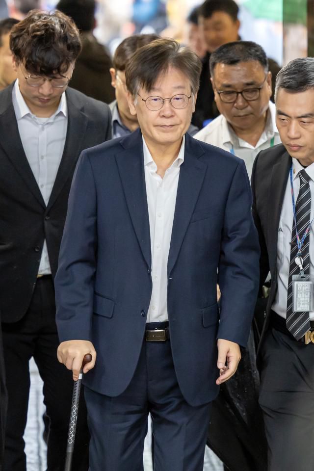 [슬라이드 뉴스] 병원 나선 이재명, 빗길 속 법원 도착…질문엔 '묵묵부답'