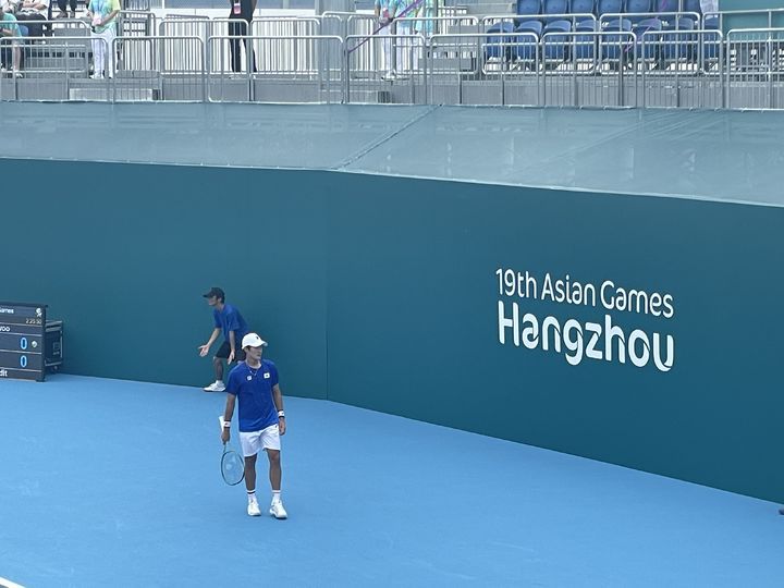 [서울=뉴시스] 2022 항저우 아시안게임 남자 단식 2회전 경기 펼치는 권순우. (사진 = 대한테니스협회 제공) *재판매 및 DB 금지 |