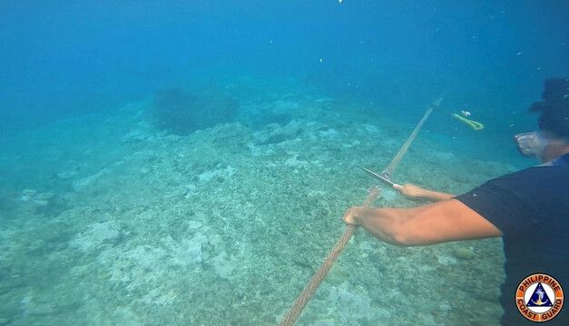 필리핀 해경이 남중국해 스카버러 암초(중국명 황옌다오)에 중국이 설치한 부표의 밧줄을 자르고 있는 장면을 지난 25일 공개했다. 로이터 연합뉴스