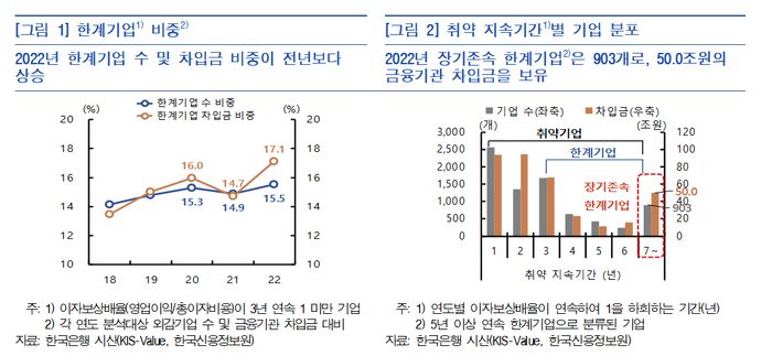 특히 5년 이상 한계기업으로 분류된 ‘장기존속 한계기업’은 903개사로 전체 한계기업의 23.1%를 차지했다. 영업손실이나 이자부담에 허덕이는 기업들은 이런 상태가 만성화하는 비중이 높다고 볼 수 있다. 이들 장기존속 한계기업은 금융기관에 총 50조원의 차입금을 보유해, 전체 한계기업이 차지하고 있는 차입금의 29.6%를 차지했다.
