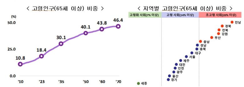 통계청은 노인 인구 비중이 2025년엔 20.6%로 늘어 우리나라가 초고령사회(전체 인구 중 노인 인구 20% 이상)로 진입하고, 2070년(46.4%)에는 인구 절반 가까이를 노인이 차지할 것으로 내다봤다.