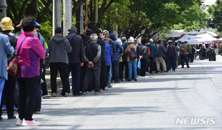 [대구=뉴시스] 이무열 기자 = 대구 달서구 무료급식소 대기 중인 노인들 모습. 2023.05.08. lmy@newsis.com |