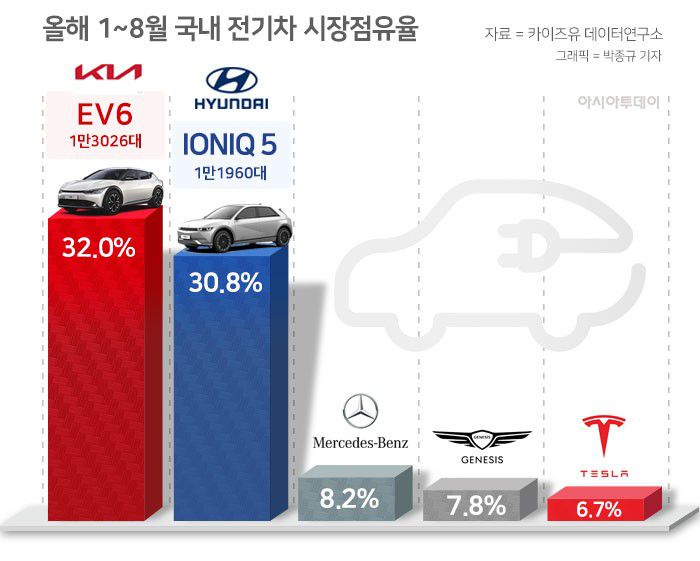 26일 카이즈유 데이터연구소에 따르면 올해 1~8월 국내 전기차 시장점유율은 기아(32.0%)·현대차(30.8%)·벤츠(8.2%)·제네시스(7.8%)·테슬라(6.7%) 등의 순이었다. 모델별로는 기아 EV6(1만3026대)가 가장 많이 팔렸으며 현대차 아이오닉 5(1만1960대)·아이오닉 6(7618대)가 그 뒤를 이었다. 기아의 니로(5707대)와 EV9(2898대)이 각각 4·5위를 기록했다.