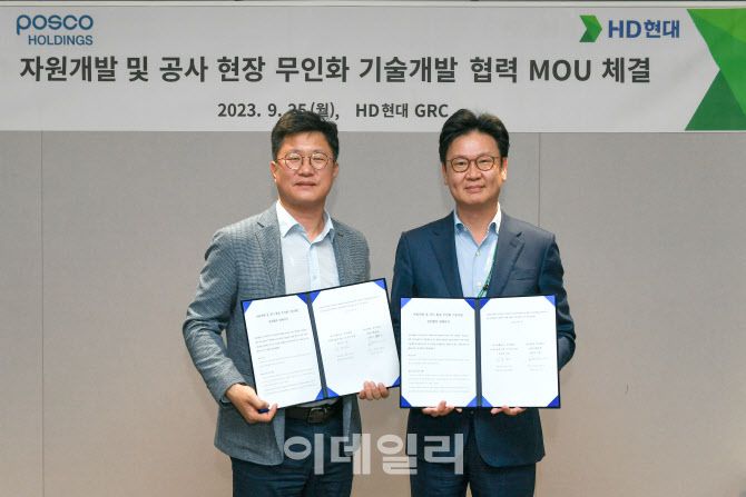 HD현대는 최근 경기도 판교 HD현대 글로벌R&D센터에서 포스코홀딩스와 ‘자원 개발 및 공사 현장의 무인화 기술 개발’을 위한 양해각서(MOU)를 체결했다고 26일 밝혔다.