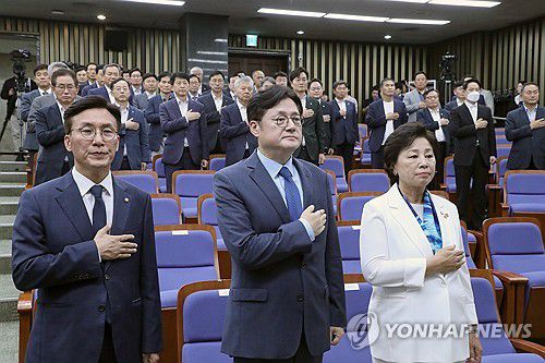 민주당 원내대표 보궐선거(서울=연합뉴스) 한상균 기자 = 26일 국회에서 열린 더불어민주당 원내대표 보궐선거 의원총회에서 김민석, 홍익표, 남인순 후보들이 국민의례를 하고 있다. 2023.9.26 xyz@yna.co.kr