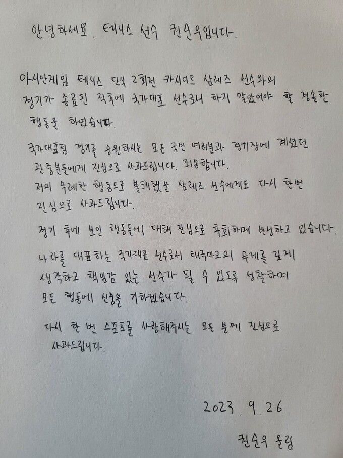 항저우 아시안게임에 출전하고 있는 테니스 남자 국가대표 권순우(26·당진시청)가 자필 사과문을 발표했다. 지난 25일 펼쳐진 대회 남자 단식 2회전에서 발생했던 자신의 ‘비매너 논란’에 대한 사과였다.