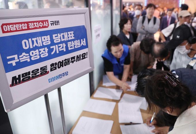 지난 24일 열린 진교훈 더불어민주당 서울 강서구청장 보궐선거 후보자의 선거사무소 개소식에서 민주당 지지자들이 이재명 대표 구속영장 기각 탄원서에 서명하고 있다. 연합뉴스